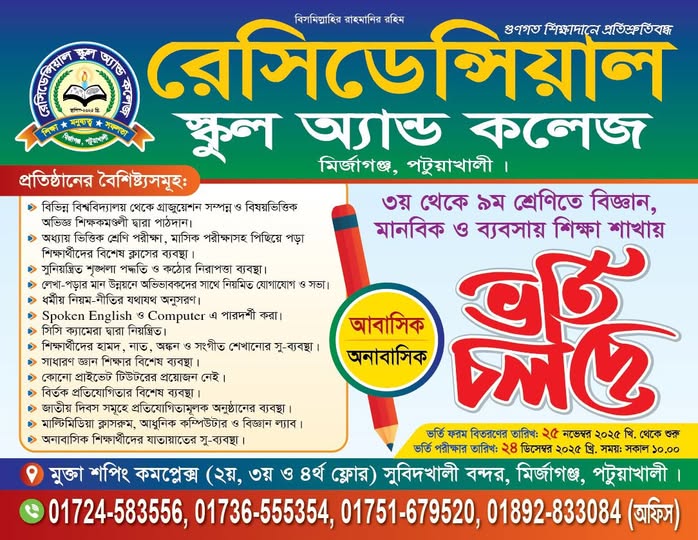 রেসিডেন্সিয়াল স্কুল অ্যান্ড কলেজ একটি আধুনিক ও মানসম্মত শিক্ষাপ্রতিষ্ঠান, যা ২০২৫ সালে প্রতিষ্ঠিত হয়। প্রতিষ্ঠার পর থেকেই আমরা শিক্ষার্থীদের জন্য একটি নিরাপদ, সুশৃঙ্খল ও শিক্ষাবান্ধব পরিবেশ গড়ে তোলার লক্ষ্য নিয়ে এগিয়ে চলেছি।